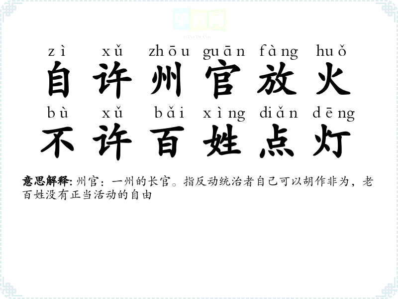 | 只准州官放火,不许百姓点灯 | 指统治者自己可以胡作非为,老百姓却连正当活动也要受到限制。 |
