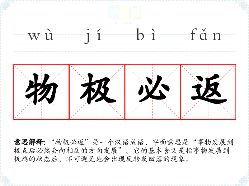 “物极必返”是一个汉语成语,字面意思是“事物发展到极点后必然会向相反的方向发展”。它的基本含义是指事物发展到极端的状态后,不可避免地会出现反转或回落的现象。