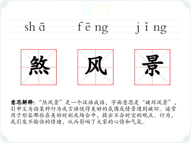 | 煞风景 | 比喻在大家高兴的时候,突然出现使人扫兴的事物。同“杀风景”。 |