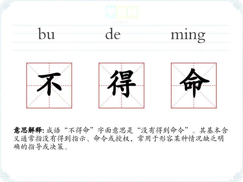 成语“不得命”字面意思是“没有得到命令”。其基本含义通常指没有得到指示、命令或授权,常用于形容某种情况缺乏明确的指导或决策。