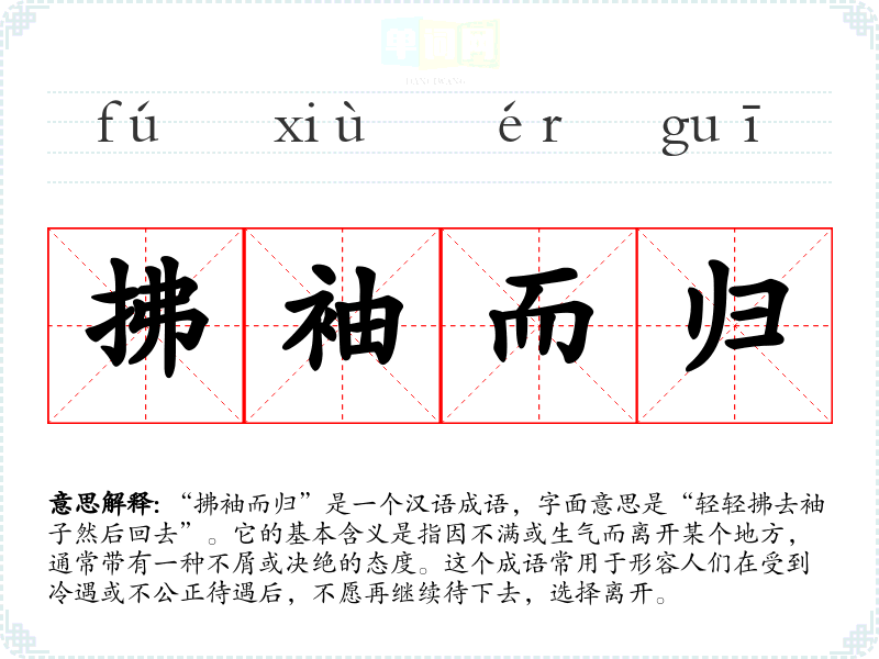 - 不离不弃:表示坚持不懈,始终陪伴,和“拂袖而归”形成鲜明对比。