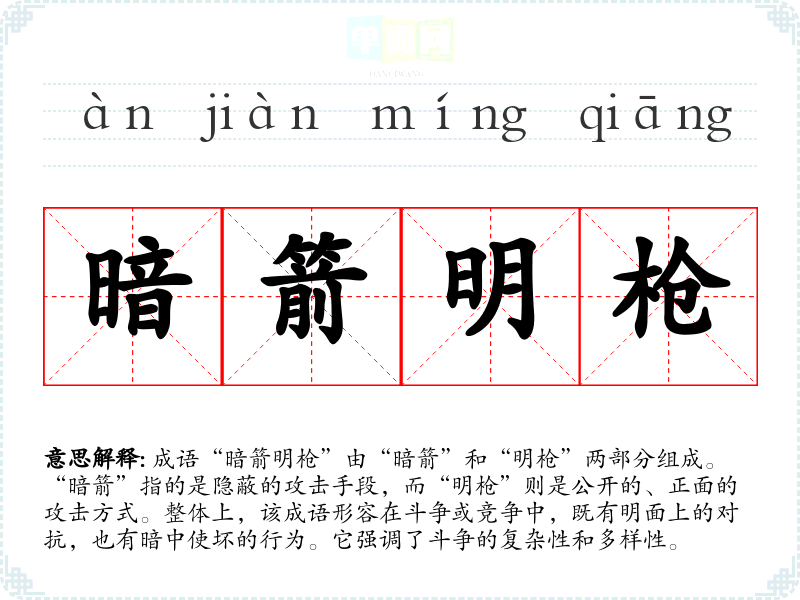 通过对“暗箭明枪”的学,我更加理解了在交流和竞争中保持警惕的重要性。这一成语在语言学上不仅丰富了我的表达,还让我意识到在生活中如何更好地应对复杂的人际关系。
