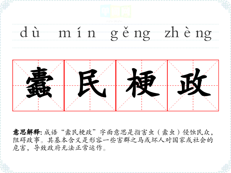 成语“蠹民梗政”字面意思是指害虫(蠹虫)侵蚀民众,阻碍政事。其基本含义是形容一些害群之马或坏人对国家或社会的危害,导致政府无法正常运作。