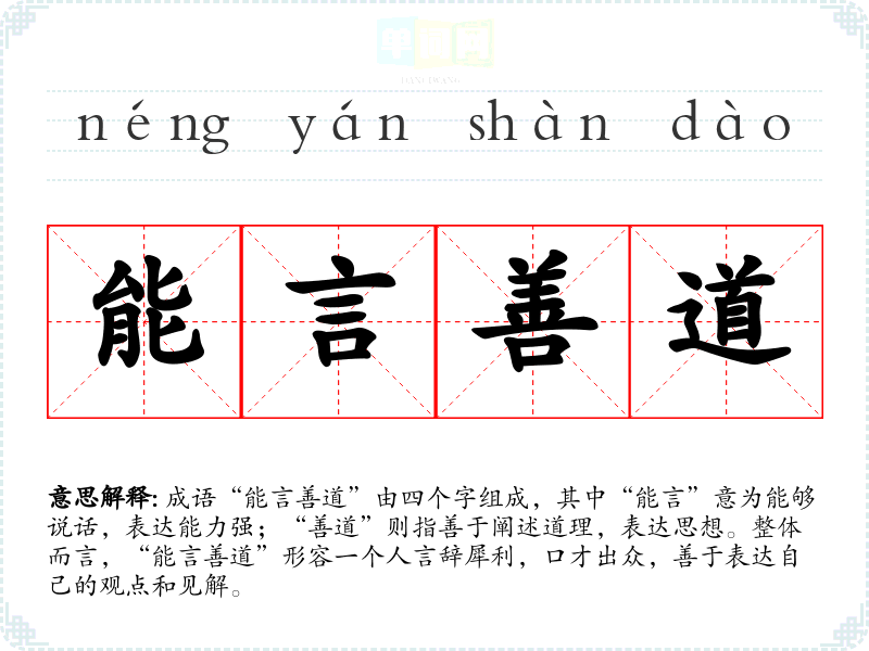 该成语通常在一些正式场合,如演讲、辩论或文学创作中使用,也可以在日常对话中形容某个人的口才。例如,在工作场合中,主管可能会称赞某个员工“他真是能言善道,能把复杂的问题说得清楚明了。”