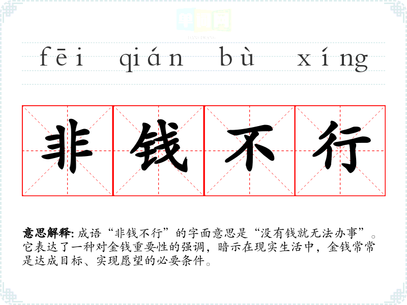 成语“非钱不行”的字面意思是“没有钱就无法办事”。它表达了一种对金钱重要性的强调,暗示在现实生活中,金钱常常是达成目标、实现愿望的必要条件。