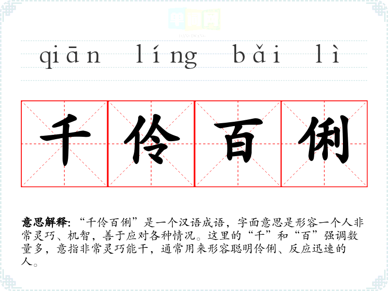 “千伶百俐”给人一种积极、灵活的情感反应,联想到聪明才智、灵活应变的能力。这种形象在生活中是许多人所向往的,特别是在面对困难时,灵活的思维往往能够帮助我们找到出路。