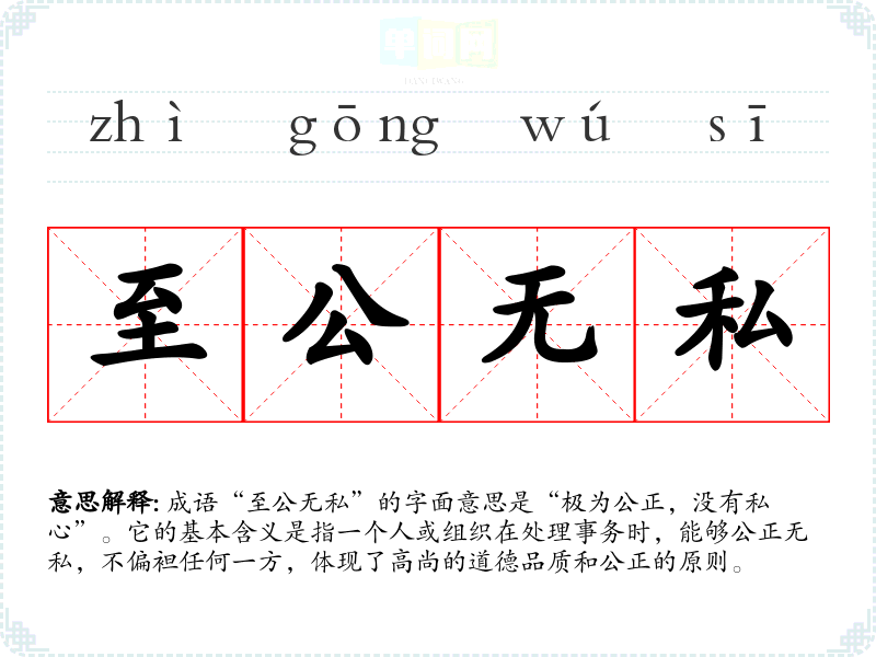 成语“至公无私”的字面意思是“极为公正,没有私心”。它的基本含义是指一个人或组织在处理事务时,能够公正无私,不偏袒任何一方,体现了高尚的道德品质和公正的原则。