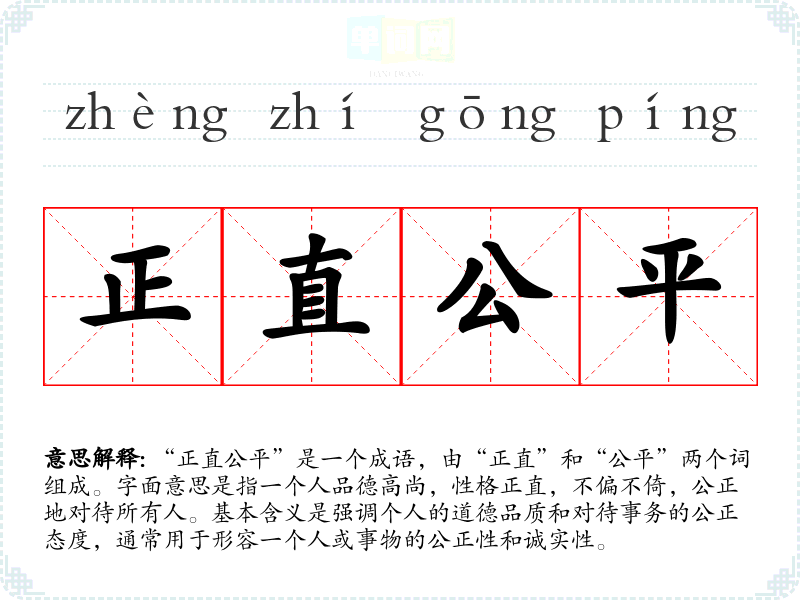 “正直公平”给人一种公正、诚实的正面情感,使人联想到信任、尊重和道德的力量。这种情感反应激励人们在生活中追求公正和诚实的价值观。