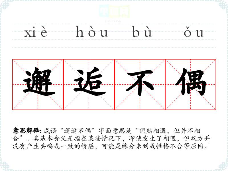 成语“邂逅不偶”字面意思是“偶然相遇,但并不相合”。其基本含义是指在某些情况下,即使发生了相遇,但双方并没有产生共鸣或一致的情感,可能是缘分未到或性格不合等原因。