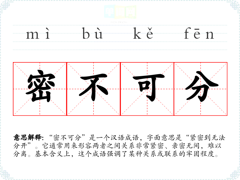 “密不可分”是一个汉语成语,字面意思是“紧密到无法分开”。它通常用来形容两者之间关系非常紧密、亲密无间,难以分离。基本含义上,这个成语强调了某种关系或联系的牢固程度。
