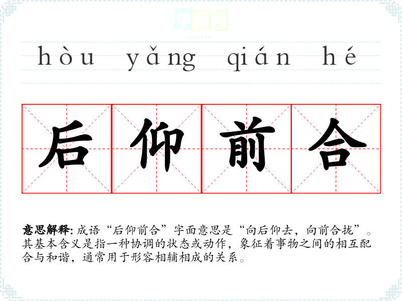 成语“后仰前合”字面意思是“向后仰去,向前合拢”。其基本含义是指一种协调的状态或动作,象征着事物之间的相互配合与和谐,通常用于形容相辅相成的关系。
