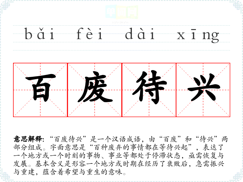 “百废待兴”是一个汉语成语,由“百废”和“待兴”两部分组成。字面意思是“百种废弃的事情都在等待兴起”,表达了一个地方或一个时刻的事物、事业等都处于停滞状态,亟需恢复与发展。基本含义是形容一个地方或时期在经历了衰败后,急需振兴与重建,蕴含着希望与重生的意味。