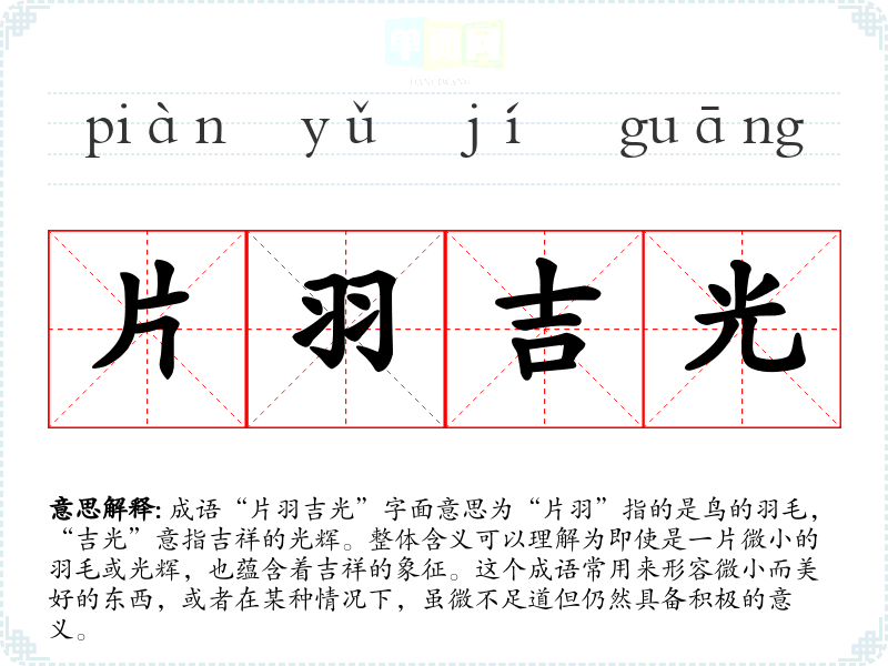 成语“片羽吉光”字面意思为“片羽”指的是鸟的羽毛,“吉光”意指吉祥的光辉。整体含义可以理解为即使是一片微小的羽毛或光辉,也蕴含着吉祥的象征。这个成语常用来形容微小而美好的东西,或者在某种情况下,虽微不足道但仍然具备积极的意义。