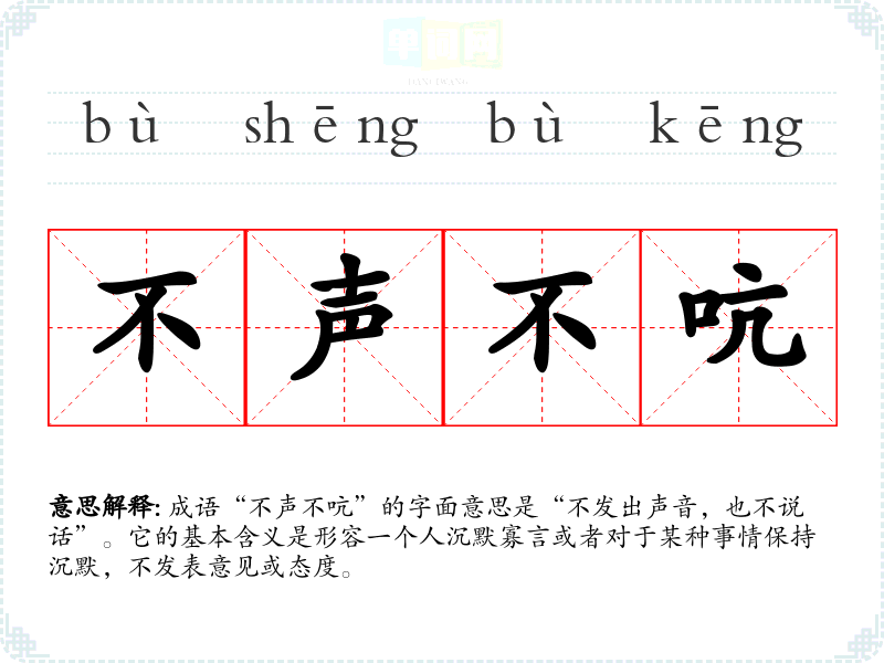 成语“不声不吭”的字面意思是“不发出声音,也不说话”。它的基本含义是形容一个人沉默寡言或者对于某种事情保持沉默,不发表意见或态度。