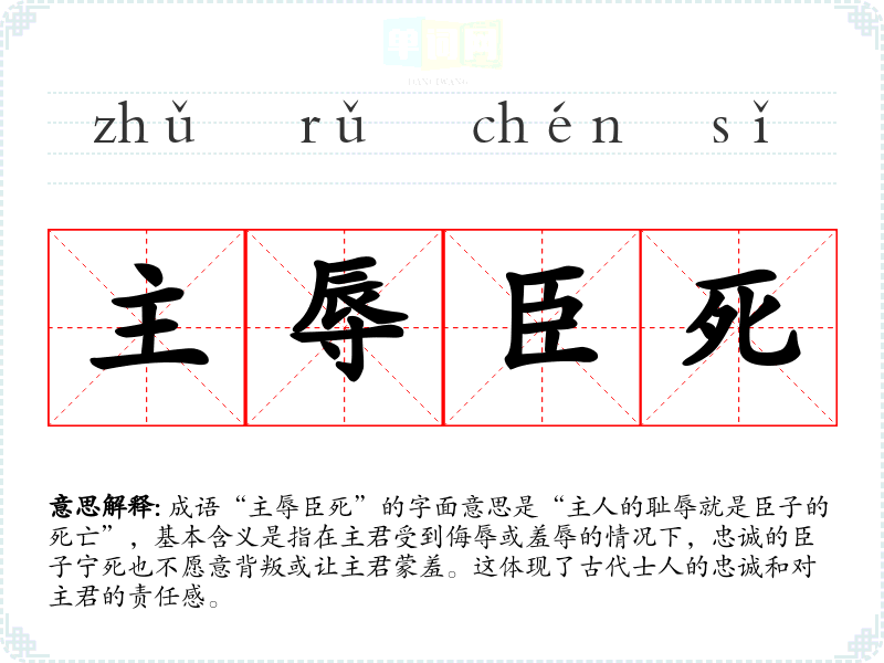 | 主辱臣死 | 主:君主。君主蒙受耻辱时,作臣子的就应当效忠而死。指以死报效君王。 |