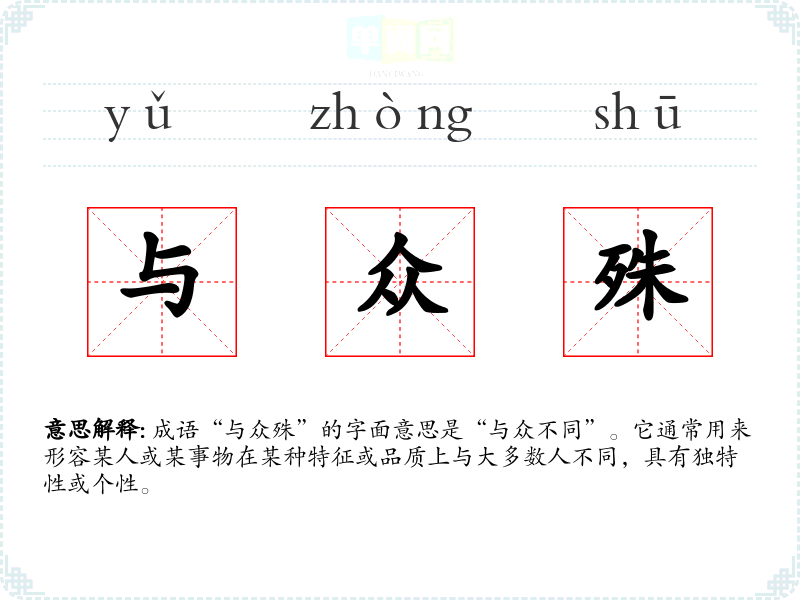 成语“与众殊”的字面意思是“与众不同”。它通常用来形容某人或某事物在某种特征或品质上与大多数人不同,具有独特性或个性。