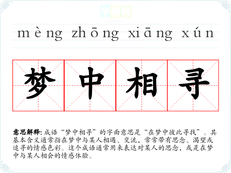 成语“梦中相寻”的字面意思是“在梦中彼此寻找”。其基本含义通常指在梦中与某人相遇、交流,常常带有思念、渴望或追寻的情感色彩。这个成语通常用来表达对某人的思念,或是在梦中与某人相会的情感体验。