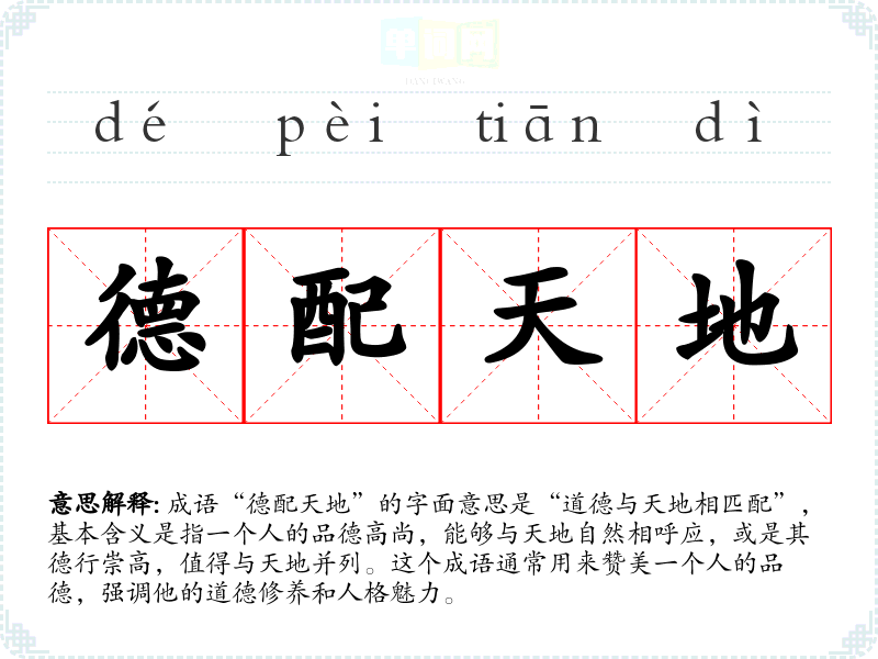 成语“德配天地”的字面意思是“道德与天地相匹配”,基本含义是指一个人的品德高尚,能够与天地自然相呼应,或是其德行崇高,值得与天地并列。这个成语通常用来赞美一个人的品德,强调他的道德修养和人格魅力。