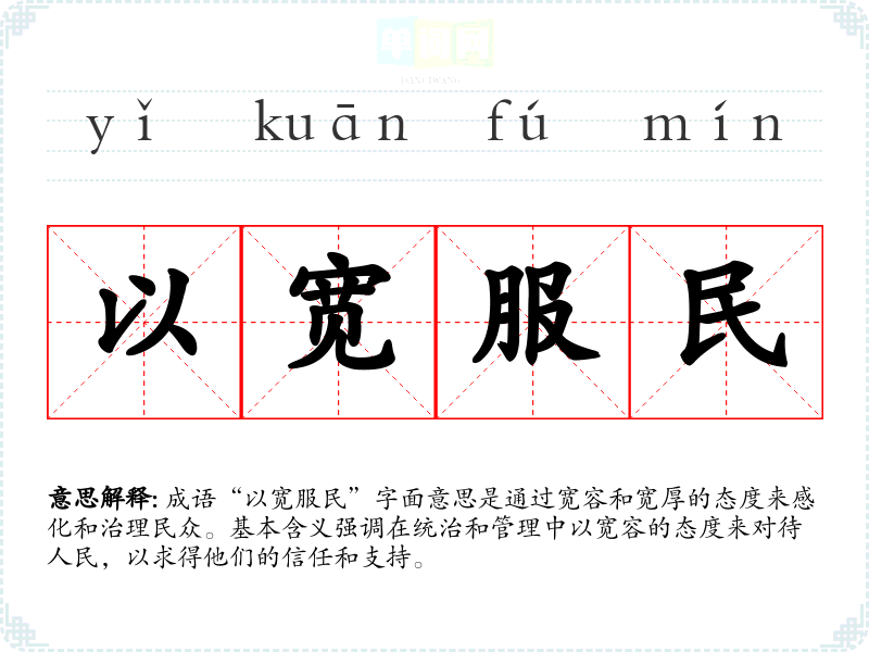 成语“以宽服民”字面意思是通过宽容和宽厚的态度来感化和治理民众。基本含义强调在统治和管理中以宽容的态度来对待人民,以求得他们的信任和支持。