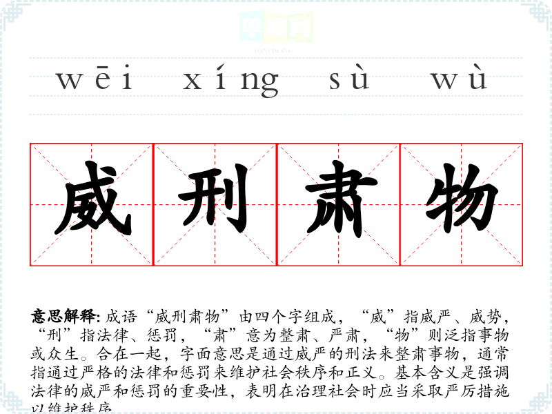 - 日常对话:在讨论社会问题时,比如谈到治安或法律公正时,可以提到“威刑肃物”来强调法律的必要性。