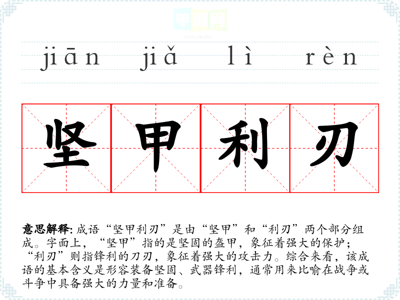 成语“坚甲利刃”是由“坚甲”和“利刃”两个部分组成。字面上,“坚甲”指的是坚固的盔甲,象征着强大的保护;“利刃”则指锋利的刀刃,象征着强大的攻击力。综合来看,该成语的基本含义是形容装备坚固、武器锋利,通常用来比喻在战争或斗争中具备强大的力量和准备。