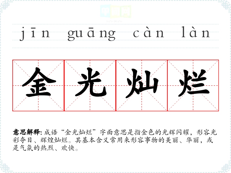 在**文化中,金色象征着财富、繁荣和幸福,因此“金光灿烂”不仅可以用来描述外在的美,还可以引申为内在的富裕和幸福感。在现代社会中,这个成语仍然适用,常用于形容成功、喜庆等场合,传递积极向上的情感。