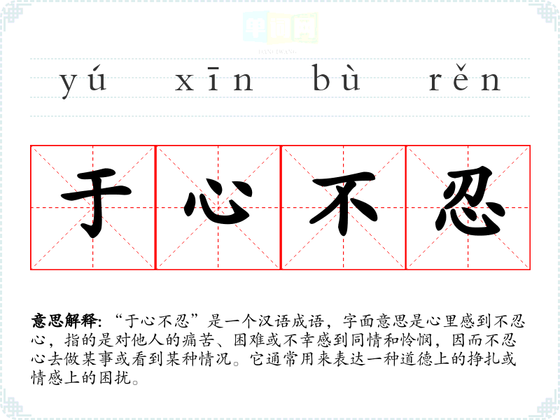 | 于心何忍 | 怎能忍心。即内心不忍。 |
