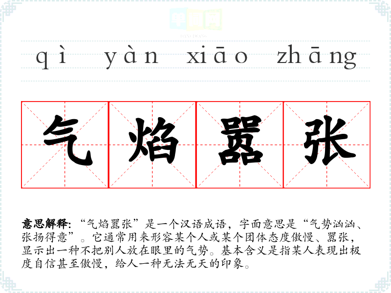 该成语的来源并没有确切的历史典故,但“气焰”和“嚣张”这两个词汇在古代文学和文言文中经常出现。“气焰”原指气势和焰火,后引申为气势和傲气;“嚣张”则有张扬、喧哗的意思。合在一起,形象地刻画了一个人或团体的傲慢态度。