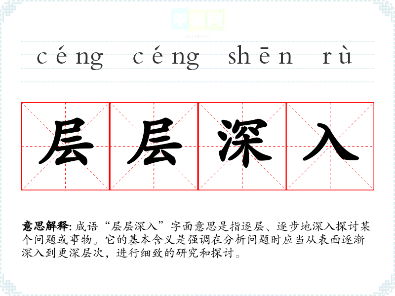 成语“层层深入”字面意思是指逐层、逐步地深入探讨某个问题或事物。它的基本含义是强调在分析问题时应当从表面逐渐深入到更深层次,进行细致的研究和探讨。