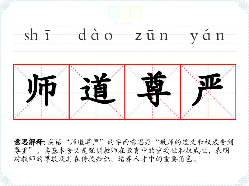 成语“师道尊严”的字面意思是“教师的道义和权威受到尊重”。其基本含义是强调教师在教育中的重要性和权威性,表明对教师的尊敬及其在传授知识、培养人才中的重要角色。