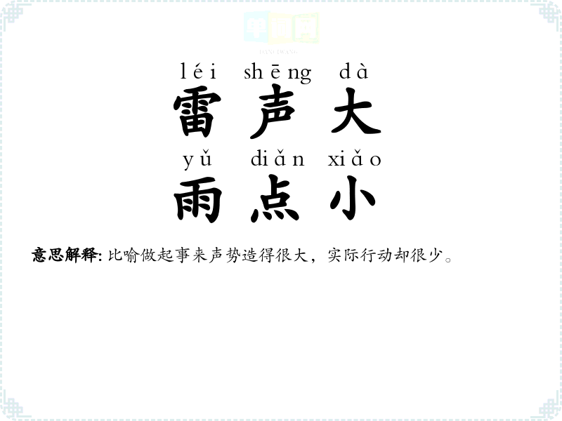 | 雷声大,雨点小 | 比喻做起事来声势造得很大,实际行动却很少。 |