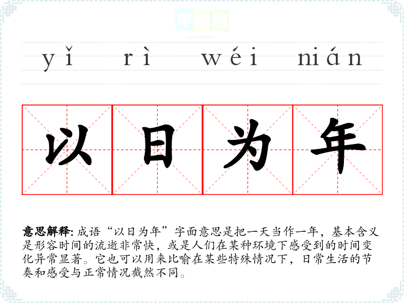 “以日为年”源于古代对时间的感知和描述,尤其在文学作品中经常用来形容时间的变化。具体的典故可能难以追溯,但类似的表达在历史文献中频繁出现,反映了人们对时间的感慨和哲学思考。