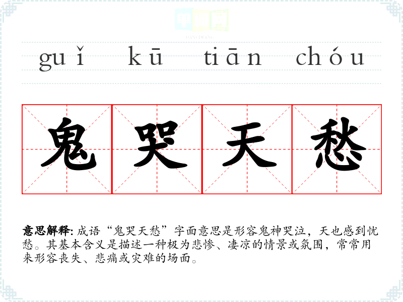 成语“鬼哭天愁”字面意思是形容鬼神哭泣,天也感到忧愁。其基本含义是描述一种极为悲惨、凄凉的情景或氛围,常常用来形容丧失、悲痛或灾难的场面。