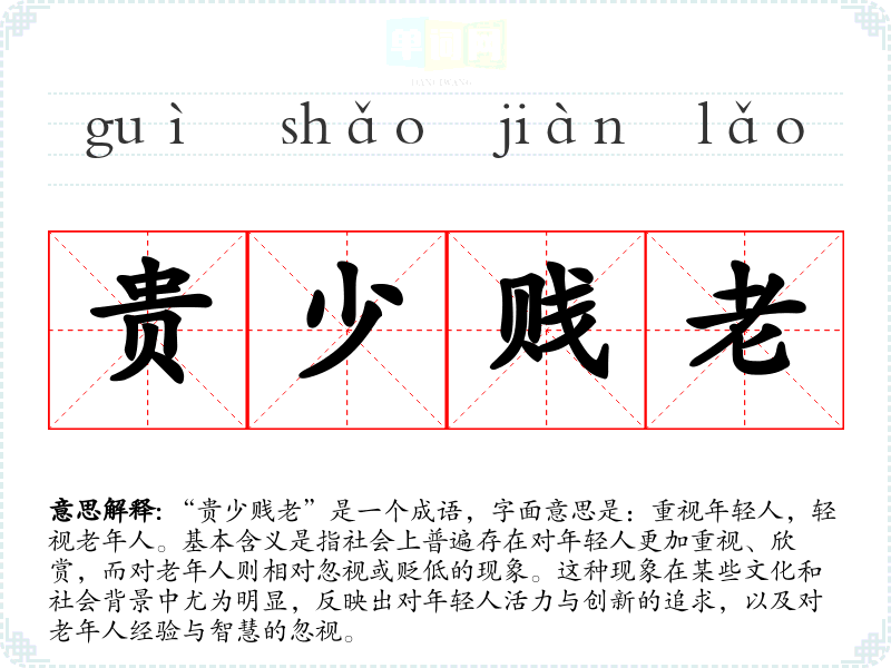 “贵少贱老”是一个成语,字面意思是:重视年轻人,轻视老年人。基本含义是指社会上普遍存在对年轻人更加重视、欣赏,而对老年人则相对忽视或贬低的现象。这种现象在某些文化和社会背景中尤为明显,反映出对年轻人活力与创新的追求,以及对老年人经验与智慧的忽视。