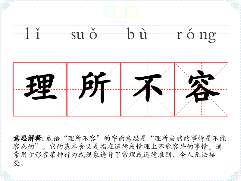 成语“理所不容”的字面意思是“理所当然的事情是不能容忍的”。它的基本含义是指在道德或情理上不能容许的事情。通常用于形容某种行为或现象违背了常理或道德准则,令人无法接受。