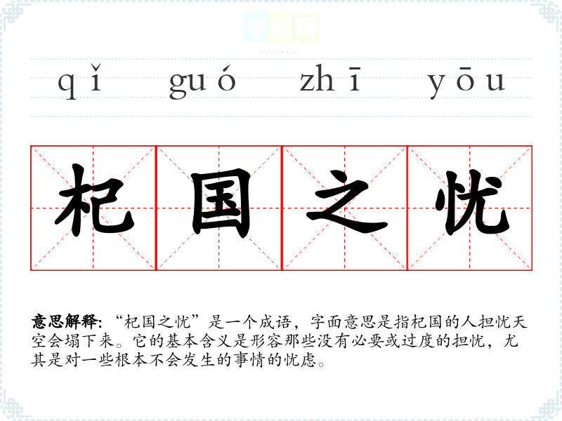 “杞国之忧”是一个成语,字面意思是指杞国的人担忧天空会塌下来。它的基本含义是形容那些没有必要或过度的担忧,尤其是对一些根本不会发生的事情的忧虑。