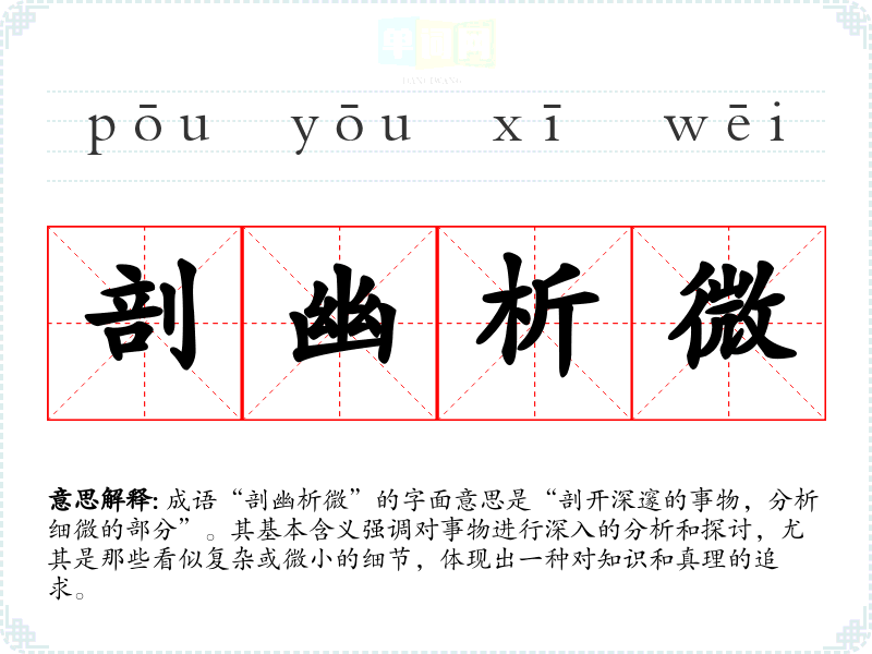 成语“剖幽析微”的字面意思是“剖开深邃的事物,分析细微的部分”。其基本含义强调对事物进行深入的分析和探讨,尤其是那些看似复杂或微小的细节,体现出一种对知识和真理的追求。