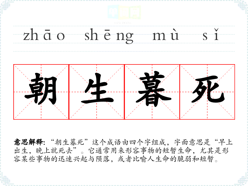 “朝生暮死”这个成语由四个字组成,字面意思是“早上出生,晚上就死去”。它通常用来形容事物的短暂生命,尤其是形容某些事物的迅速兴起与陨落,或者比喻人生命的脆弱和短暂。
