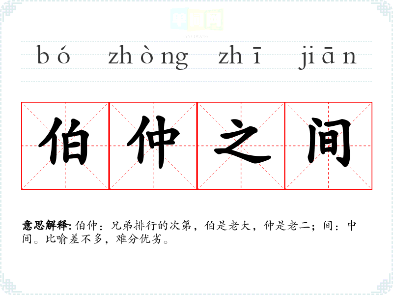 伯仲:兄弟排行的次第,伯是老大,仲是老二;间:中间。比喻差不多,难分优劣。