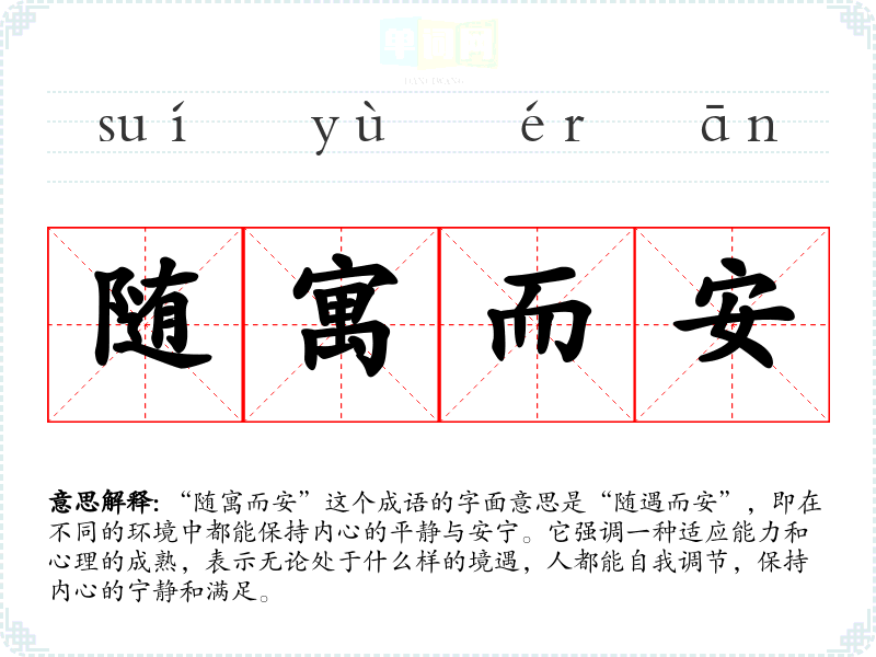 “随寓而安”这个成语的字面意思是“随遇而安”,即在不同的环境中都能保持内心的平静与安宁。它强调一种适应能力和心理的成熟,表示无论处于什么样的境遇,人都能自我调节,保持内心的宁静和满足。