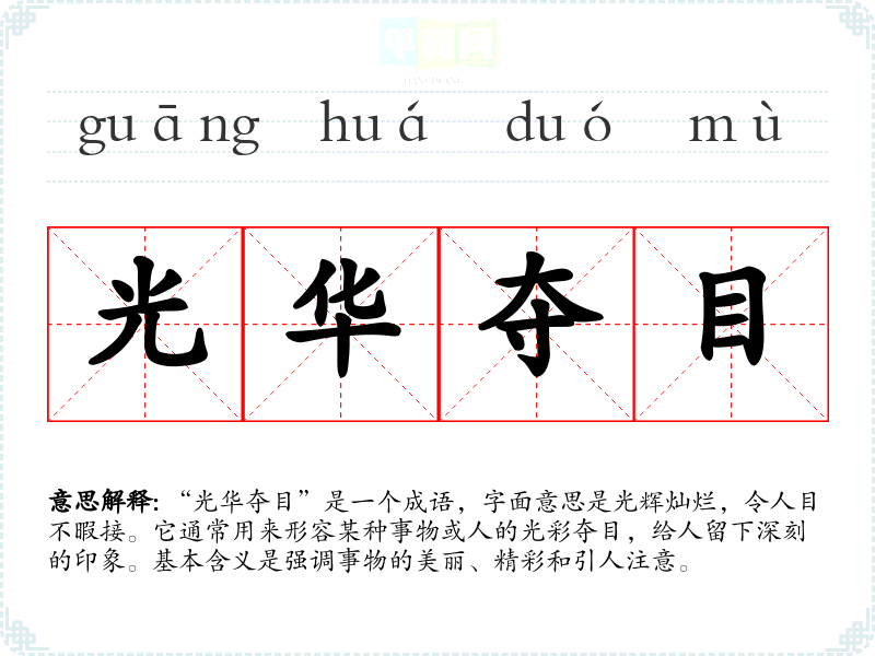 “光华夺目”这个成语并没有明确的古代典故出处,但它是由“光华”和“夺目”两个部分组成。“光华”指的是光亮和华丽,而“夺目”则意指光亮得让人无法直视。这个成语的形成反映了古代汉语中对光辉与美丽的高度赞美。