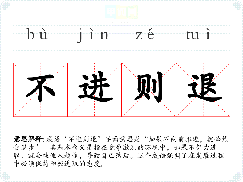 成语“不进则退”字面意思是“如果不向前推进,就必然会退步”。其基本含义是指在竞争激烈的环境中,如果不努力进取,就会被他人超越,导致自己落后。这个成语强调了在发展过程中必须保持积极进取的态度。
