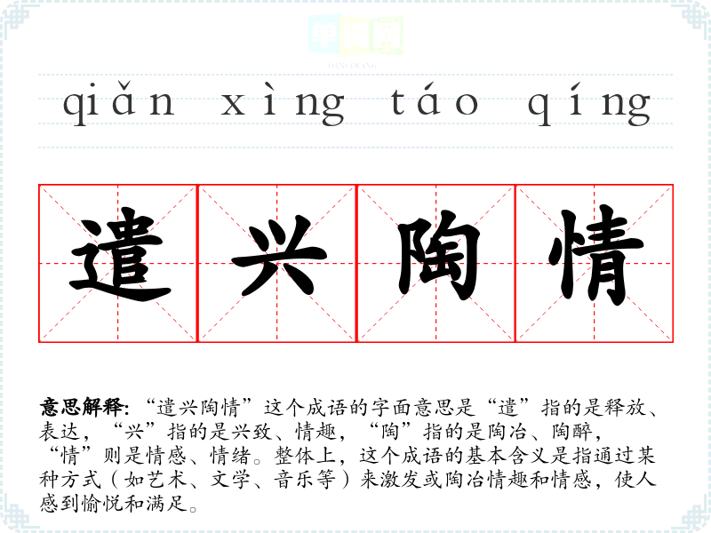 “遣兴陶情”这个成语的字面意思是“遣”指的是释放、表达,“兴”指的是兴致、情趣,“陶”指的是陶冶、陶醉,“情”则是情感、情绪。整体上,这个成语的基本含义是指通过某种方式(如艺术、文学、音乐等)来激发或陶冶情趣和情感,使人感到愉悦和满足。