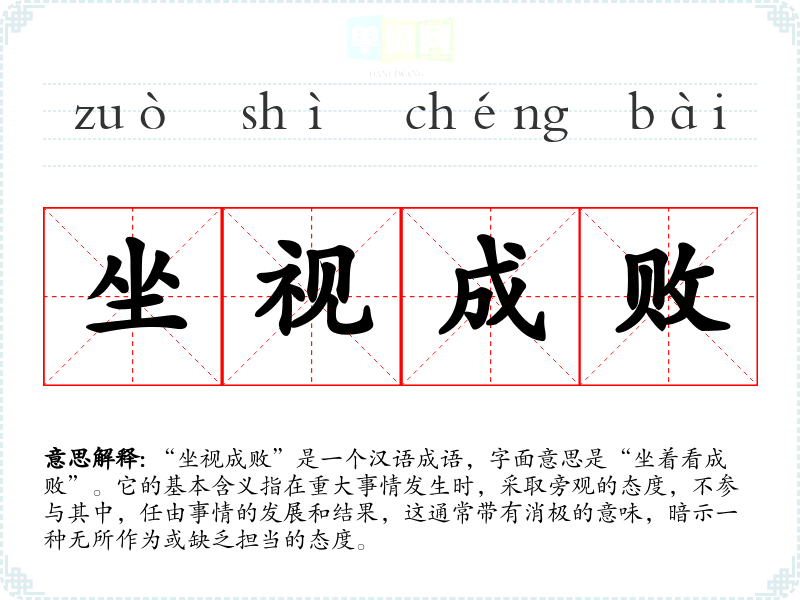 “坐视成败”是一个汉语成语,字面意思是“坐着看成败”。它的基本含义指在重大事情发生时,采取旁观的态度,不参与其中,任由事情的发展和结果,这通常带有消极的意味,暗示一种无所作为或缺乏担当的态度。