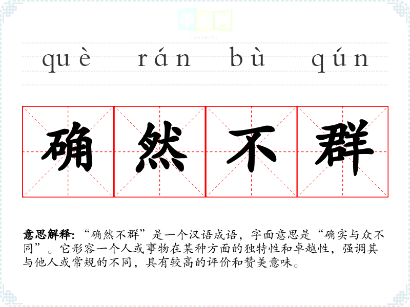 “确然不群”是一个汉语成语,字面意思是“确实与众不同”。它形容一个人或事物在某种方面的独特性和卓越性,强调其与他人或常规的不同,具有较高的评价和赞美意味。