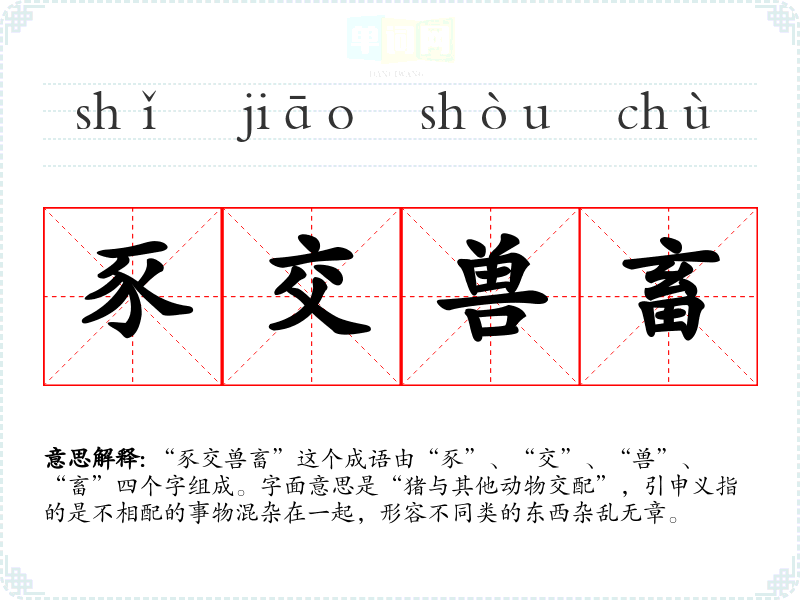 “豕交兽畜”这个成语由“豕”、“交”、“兽”、“畜”四个字组成。字面意思是“猪与其他动物交配”,引申义指的是不相配的事物混杂在一起,形容不同类的东西杂乱无章。