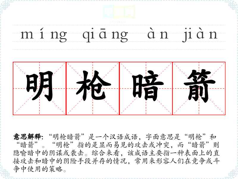 “明枪暗箭”是一个汉语成语,字面意思是“明枪”和“暗箭”。“明枪”指的是显而易见的攻击或冲突,而“暗箭”则隐喻暗中的阴谋或袭击。综合来看,该成语主要指一种表面上的直接攻击和暗中的阴险手段并存的情况,常用来形容人们在竞争或斗争中使用的策略。