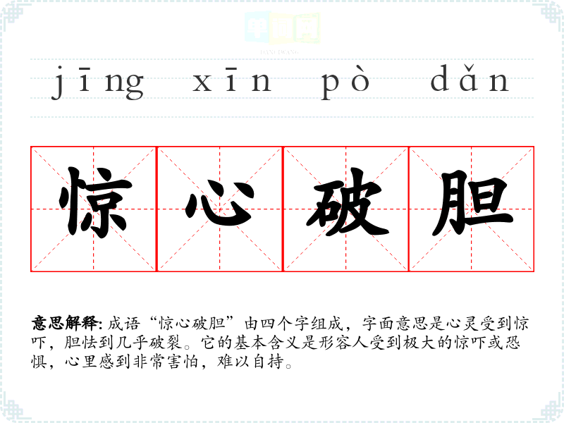 成语“惊心破胆”由四个字组成,字面意思是心灵受到惊吓,胆怯到几乎破裂。它的基本含义是形容人受到极大的惊吓或恐惧,心里感到非常害怕,难以自持。