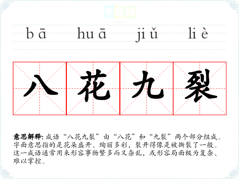 - 日常对话:在讨论某些复杂事务或人际关系时,可以用“八花九裂”来形容情形的复杂程度。