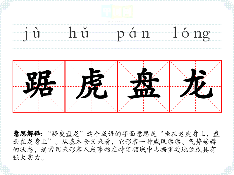 “踞虎盘龙”这个成语的字面意思是“坐在**身上,盘旋在龙身上”。从基本含义来看,它形容一种威风凛凛、气势磅礴的状态,通常用来形容人或事物在特定领域中占据重要地位或具有强大实力。